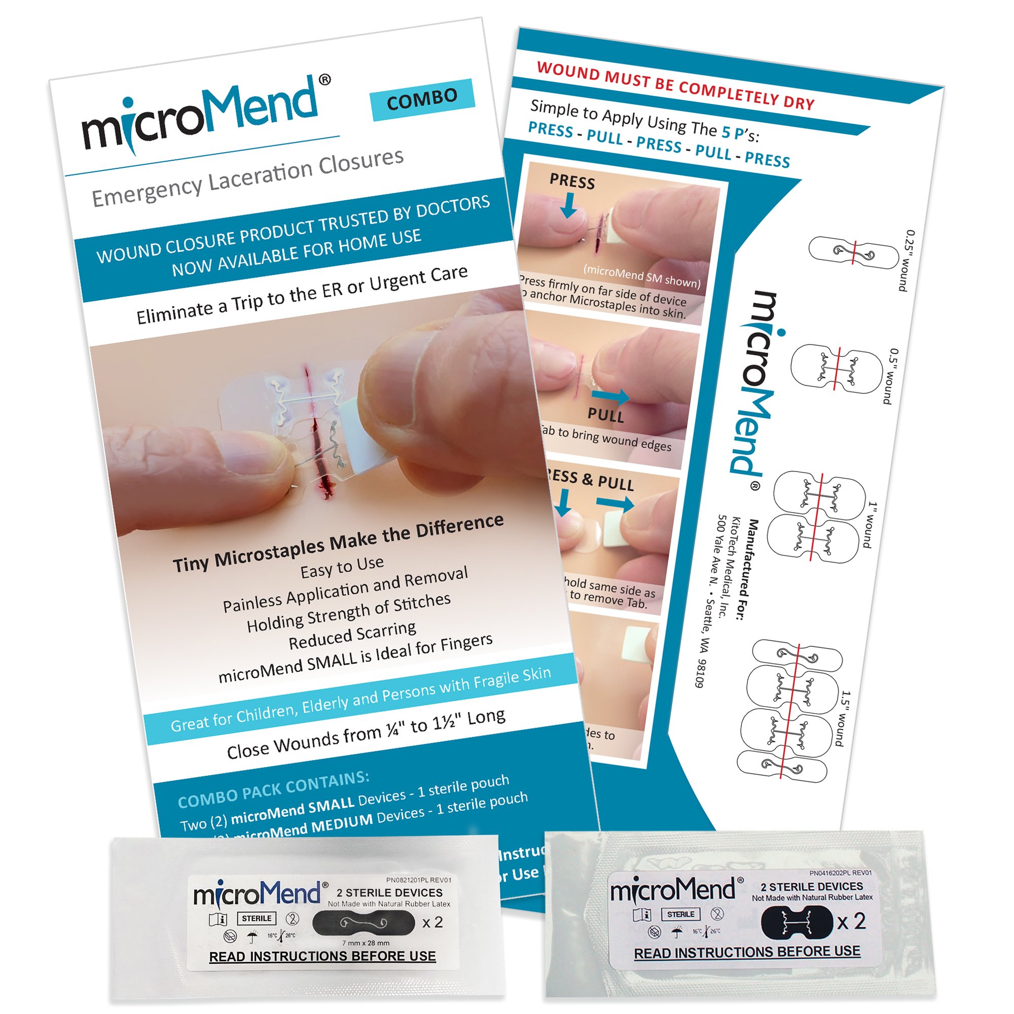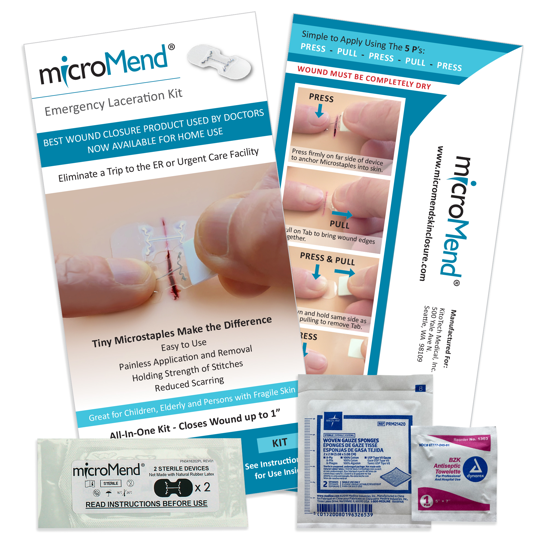 "microMend is a great alternative to suturing lacerations and cuts. It is as easy to use as a bandage and has miniature staples that provide holding strength that rivals sutures. It goes on painlessly and can be applied in seconds. Wounds heal rapidly with less scarring."